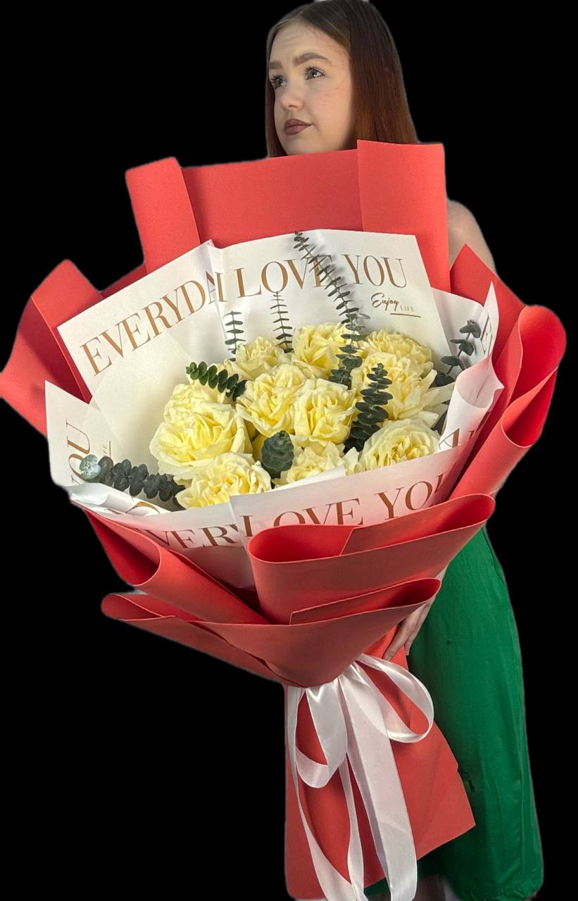 Букет-гигант из кремовых французских роз с эвкалиптом
