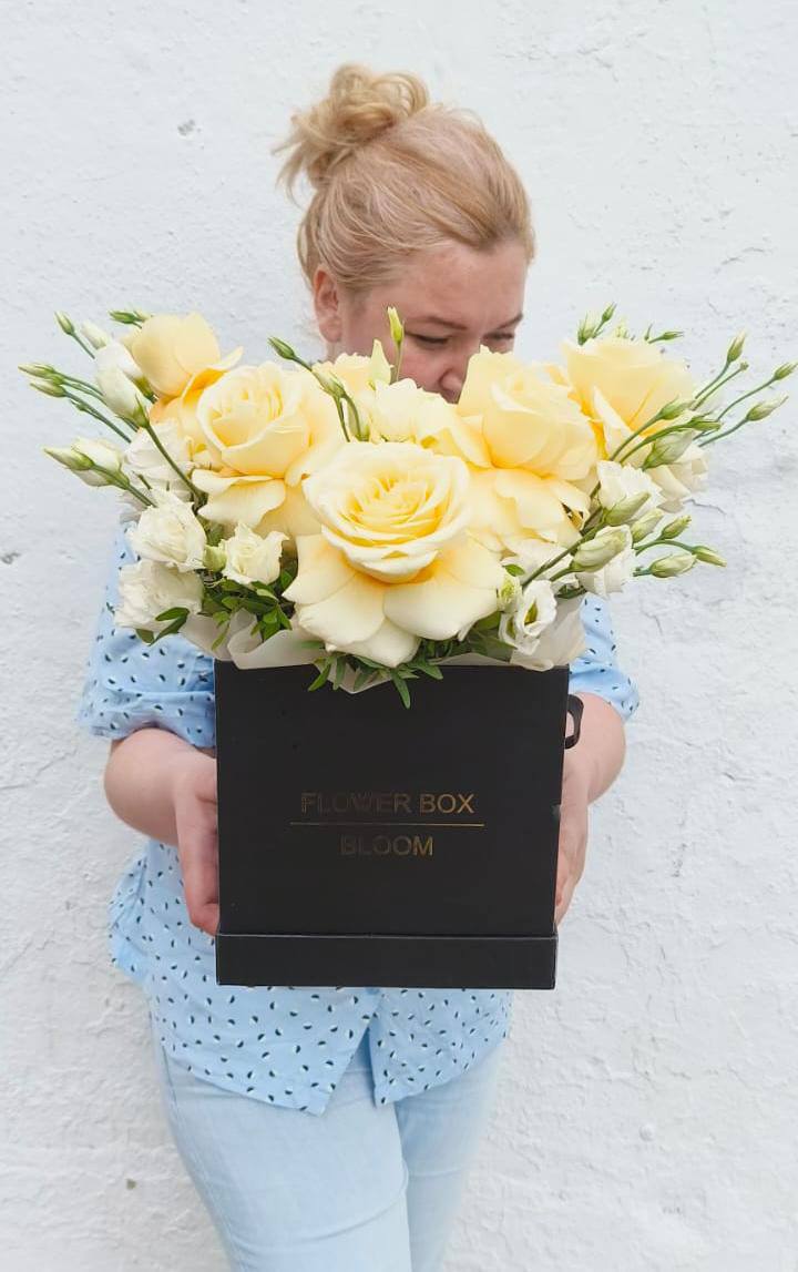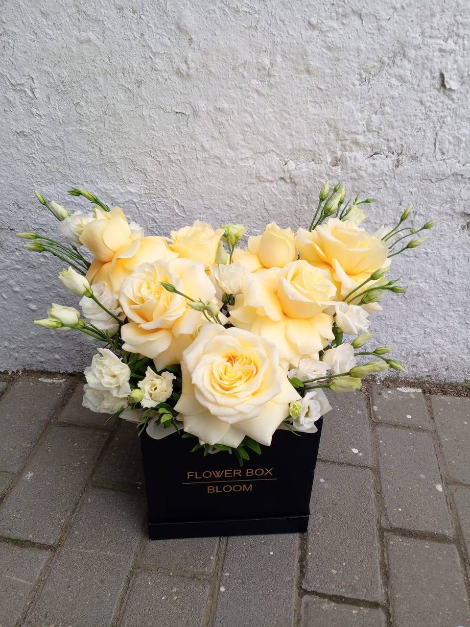 Утонченная композиция в коробке из кремовых французских роз и эустомы. Идеальный подарок для самых нежных чувств.