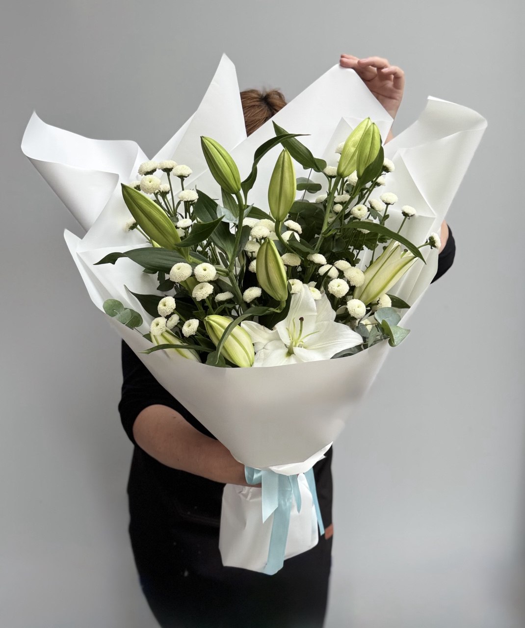 Этот очаровательный букет сочетает в себе величественную красоту лилий и воздушную легкость белой хризантемы. Крупные, ароматные бутоны лилий, символизирующие чистоту и благородство, окружены нежной дымкой мелких цветочков хризантемы, придающих композиции легкость и воздушность.