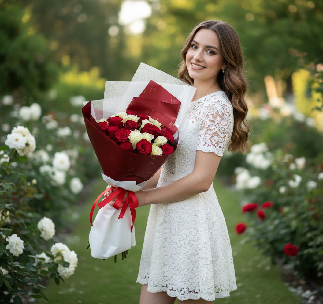 Элегантный букет из 25 красных и белых роз, оформленный в стильной упаковке