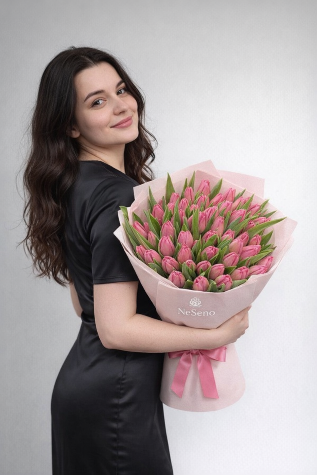 Букет из 55 розовых тюльпанов — это воплощение нежности, весны и свежести. Он словно соткан из утренней зари, запечатленной в лепестках.