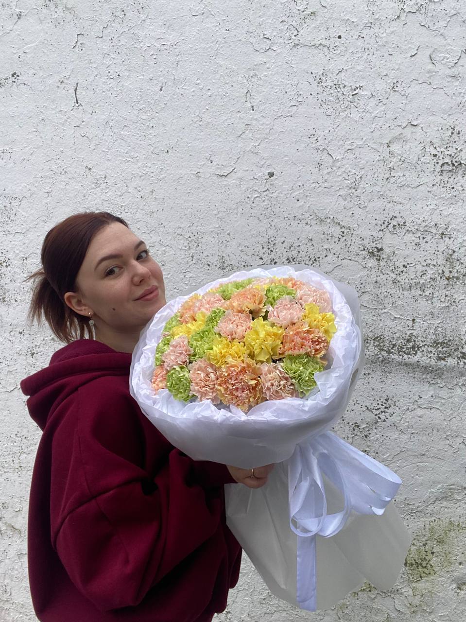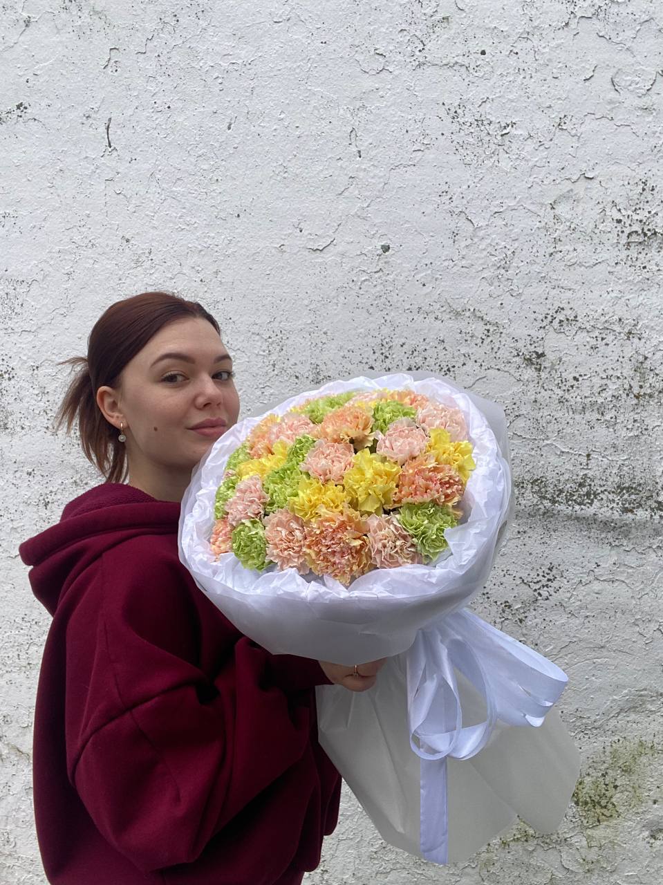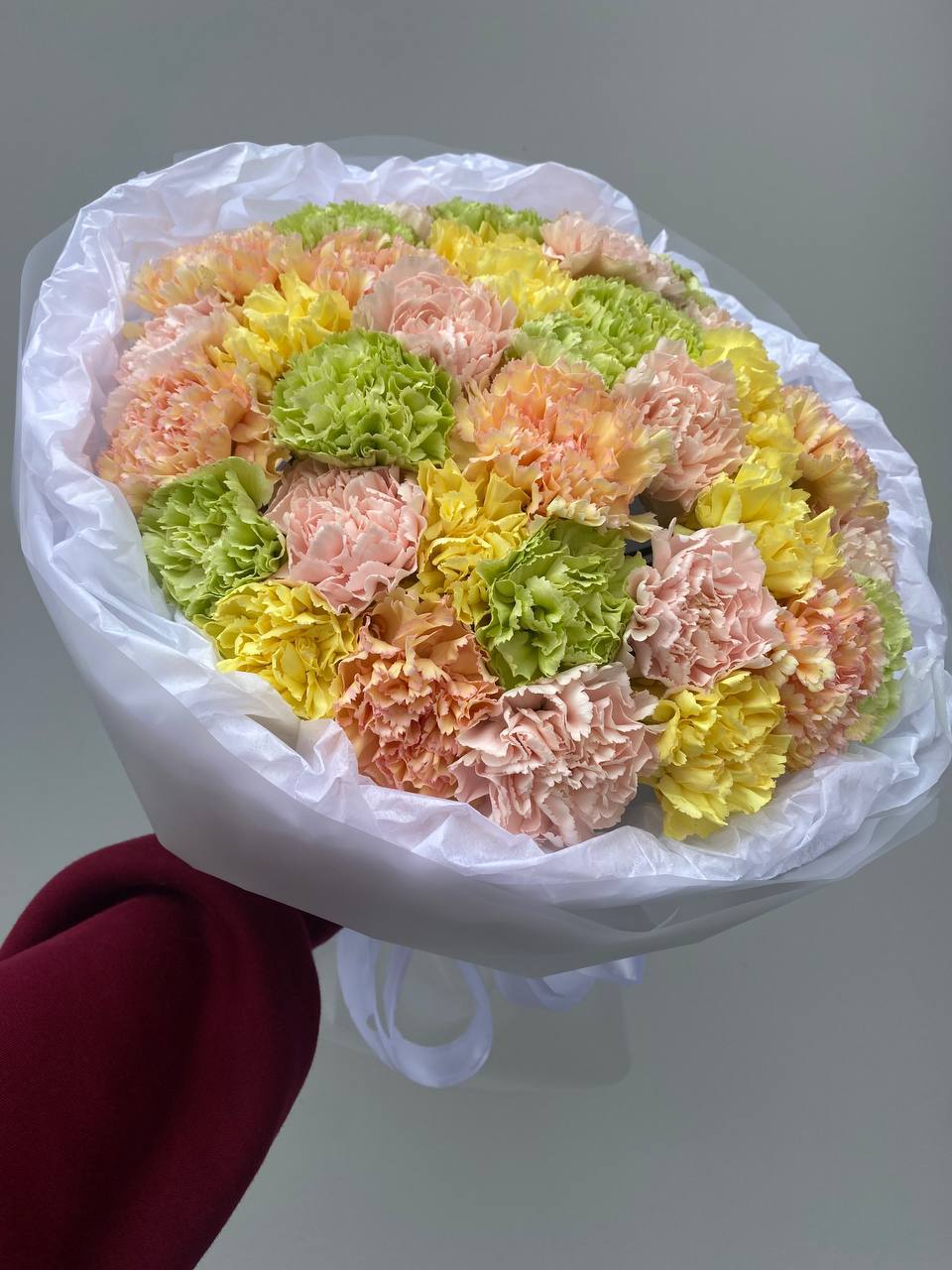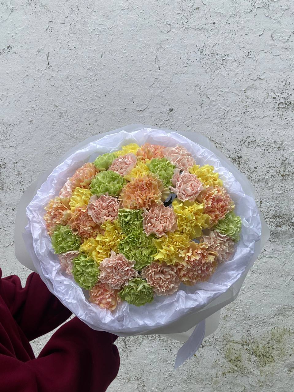 Стильный и яркий букет из свежих диантусов разных оттенков в современной упаковке. Закажите с доставкой и подарите радость!