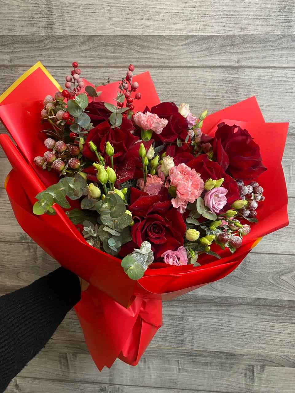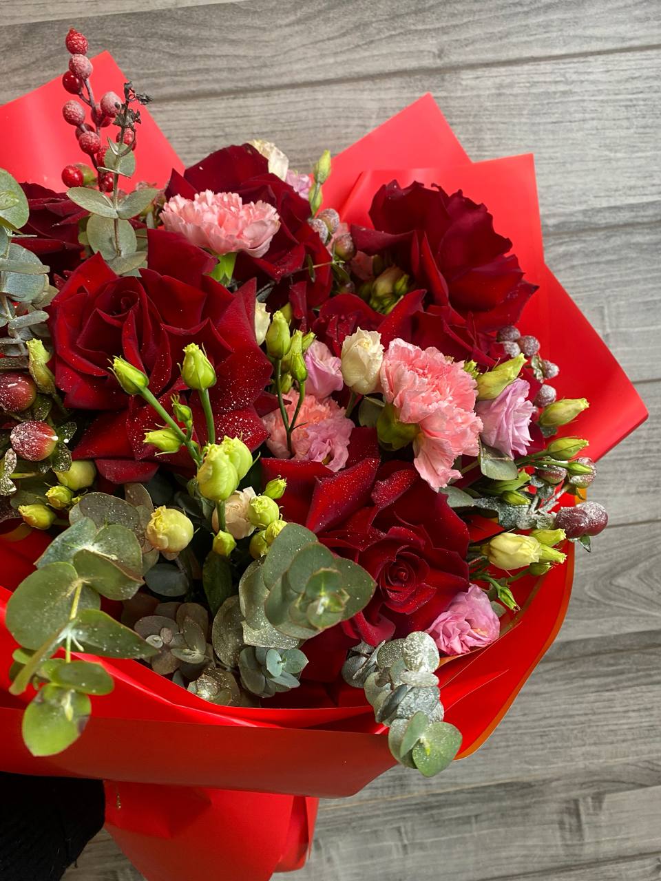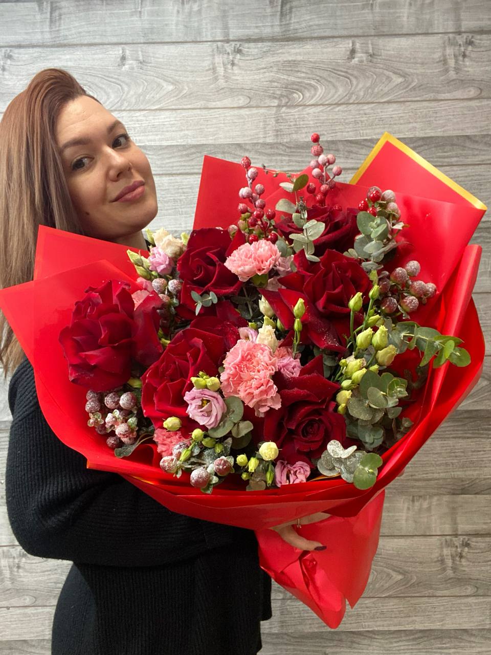 Элегантный сборный букет из эустомы, диантусов, роз и эвкалипта. Свежие цветы, стильная упаковка и быстрая доставка. Закажите букет на подарок или особый случай.