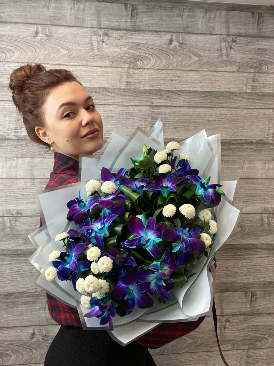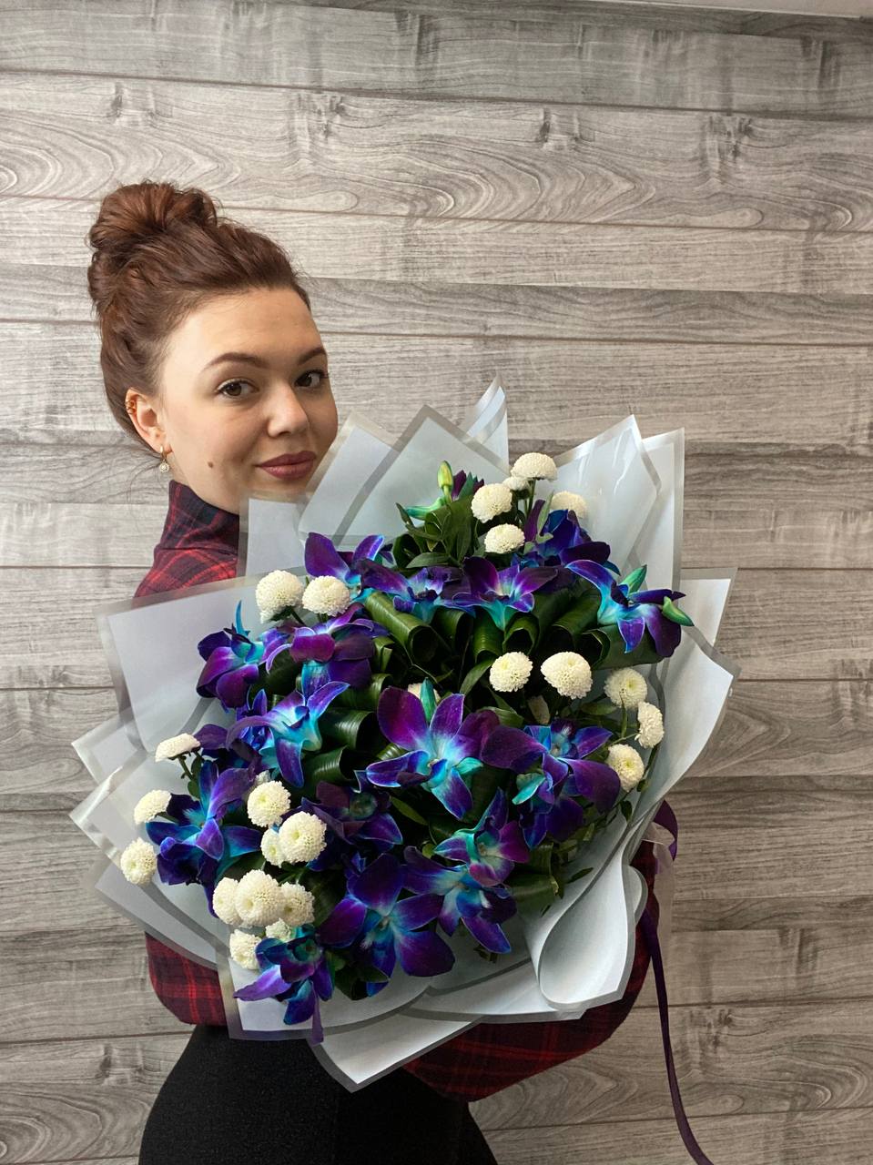Очаровательный букет, сочетающий в себе экзотическую красоту синих орхидей и нежность белых шариков хризантем. Этот элегантный и утонченный цветочный ансамбль станет незабываемым подарком для самых особенных моментов.