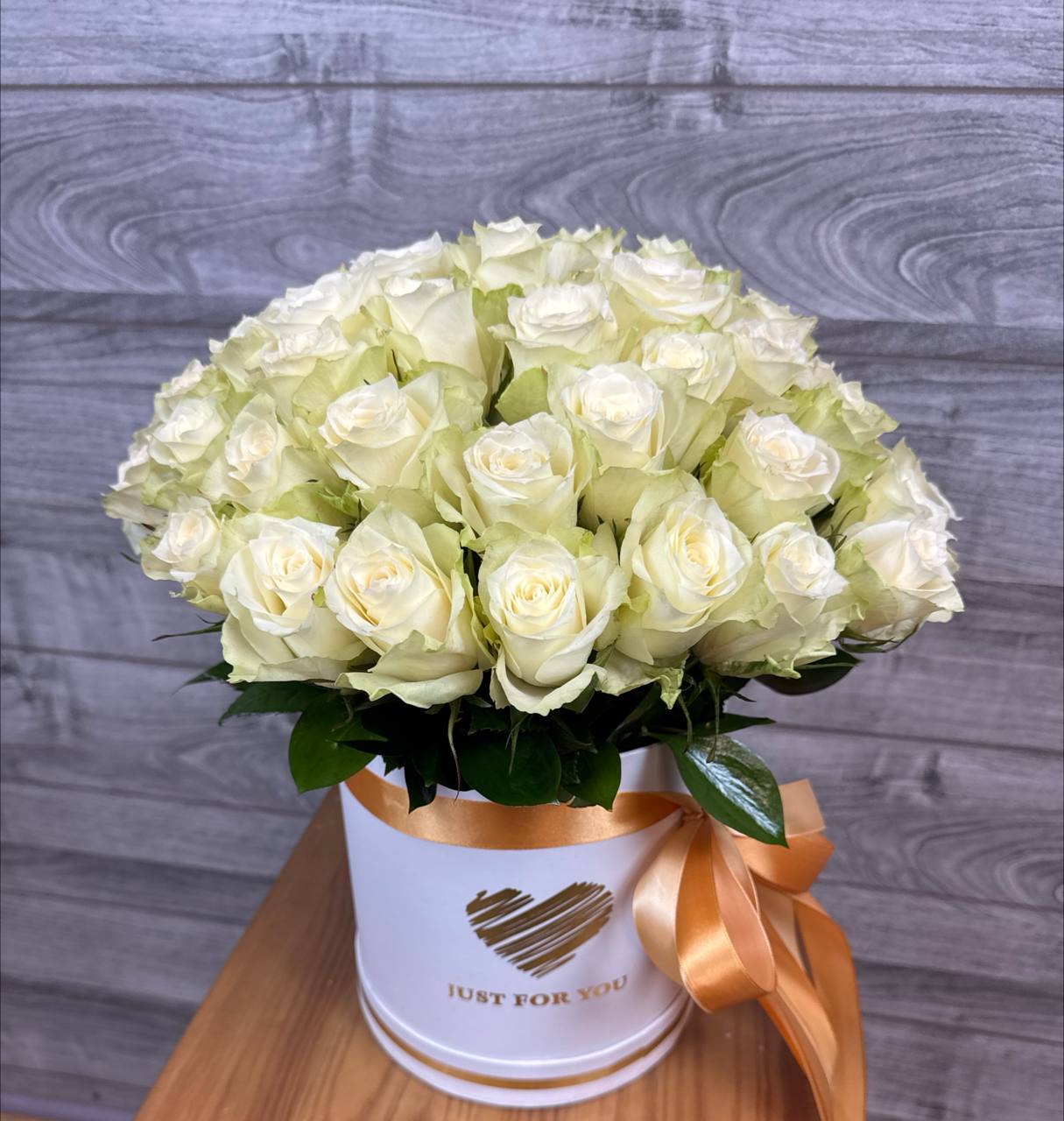 Букет в коробке с белыми розами L — это идеальный подарок для особого случая. В нашем букете 55 великолепных роз, которые завораживают своей красотой и нежностью.