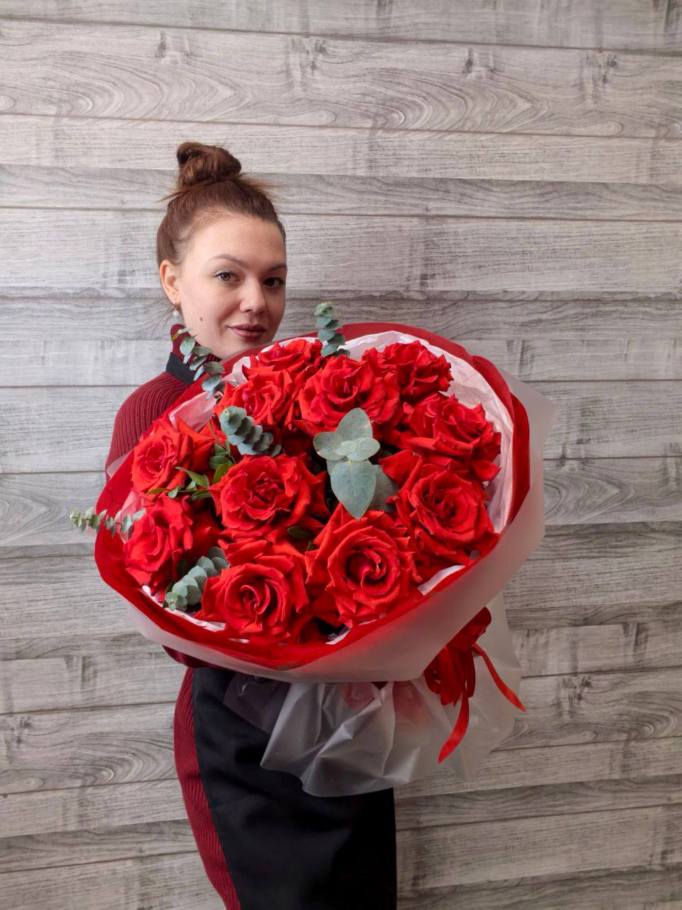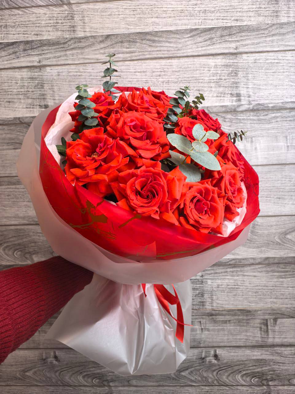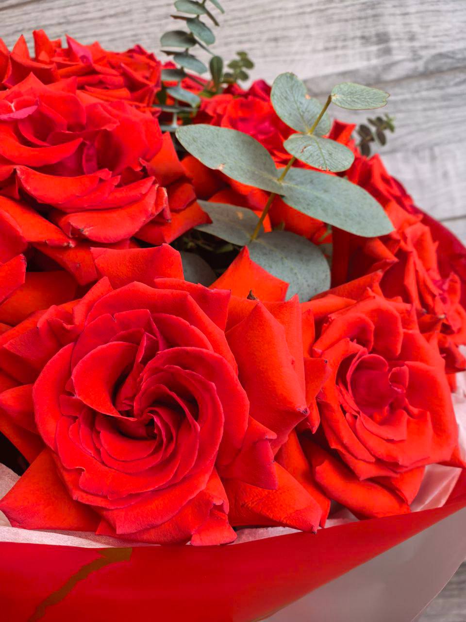 Погрузитесь в мир страсти и элегантности с нашим восхитительным букетом из красных французских роз, искусно дополненным ароматным эвкалиптом. Этот букет – идеальное сочетание классической красоты и современной стильности.