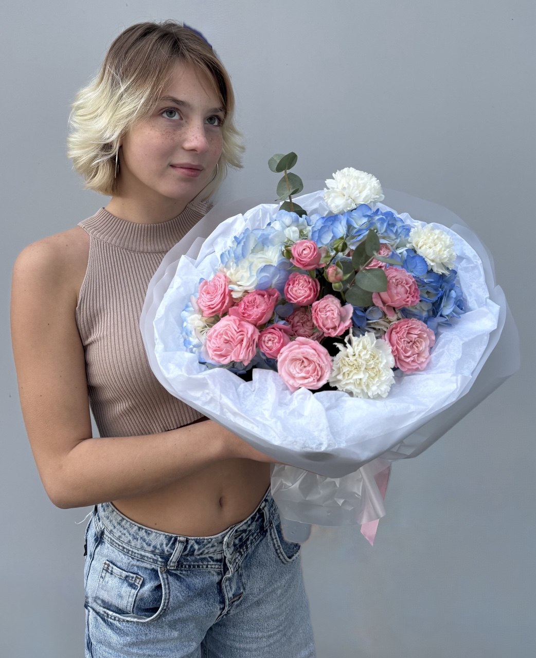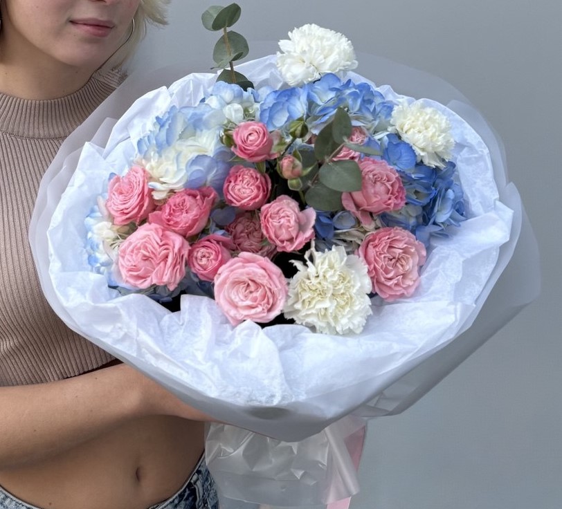 Этот сборный букет – настоящее воплощение нежности и изысканности! Пышная гортензия в сочетании с изящными диантусами, нежными кустовыми розами и ароматным эвкалиптом создают неповторимую композицию, которая никого не оставит равнодушным. Разнообразие текстур и оттенков в этом букете делают его по-настоящему уникальным и запоминающимся подарком. Этот букет идеально подойдет для любого случая – от романтического свидания до важного торжества. Подарите своим близким красоту и радость с этим прекрасным букетом! Вы можете выбрать цветовую гамму букета, чтобы он идеально соответствовал вкусу и предпочтениям получателя.