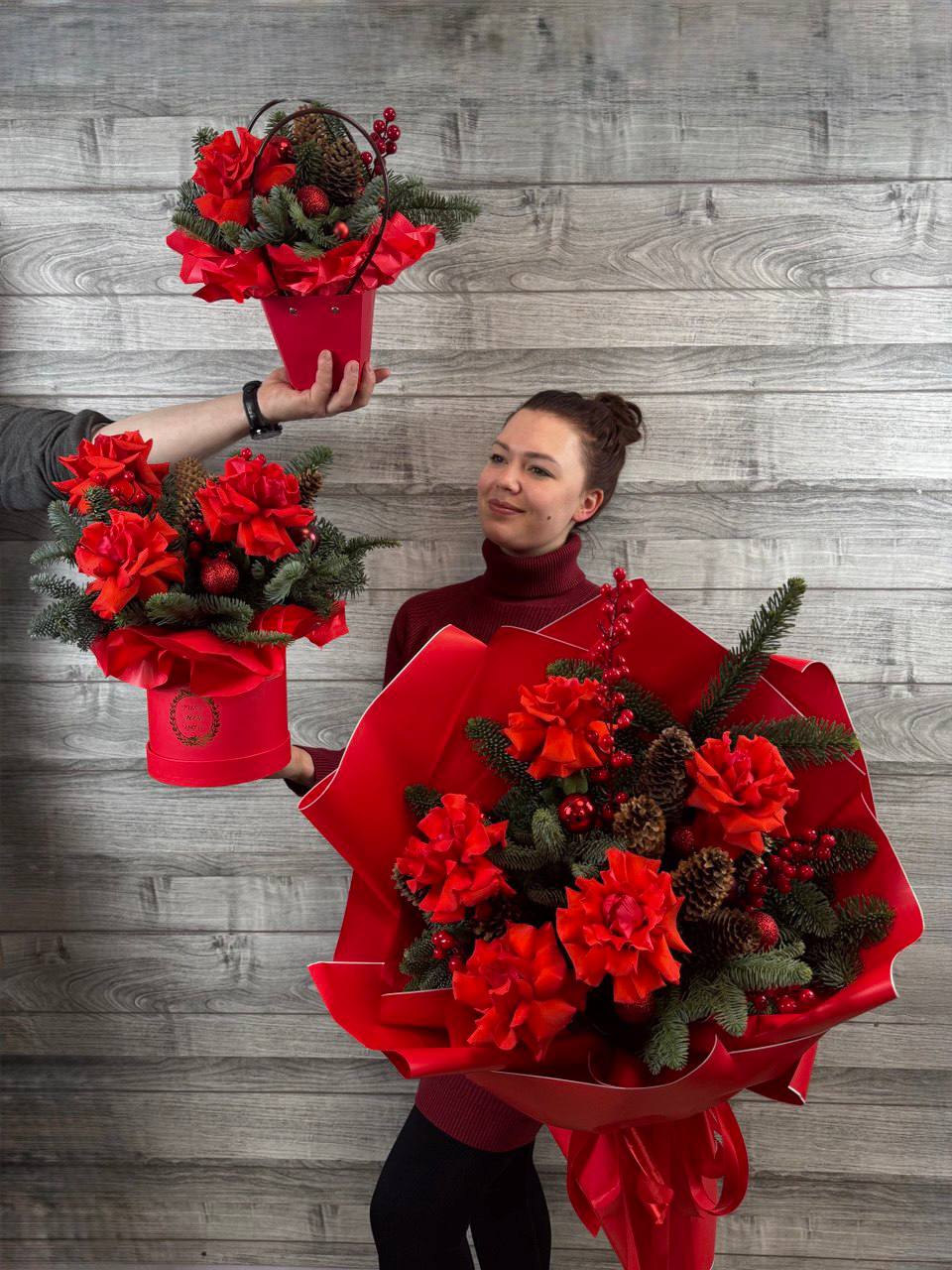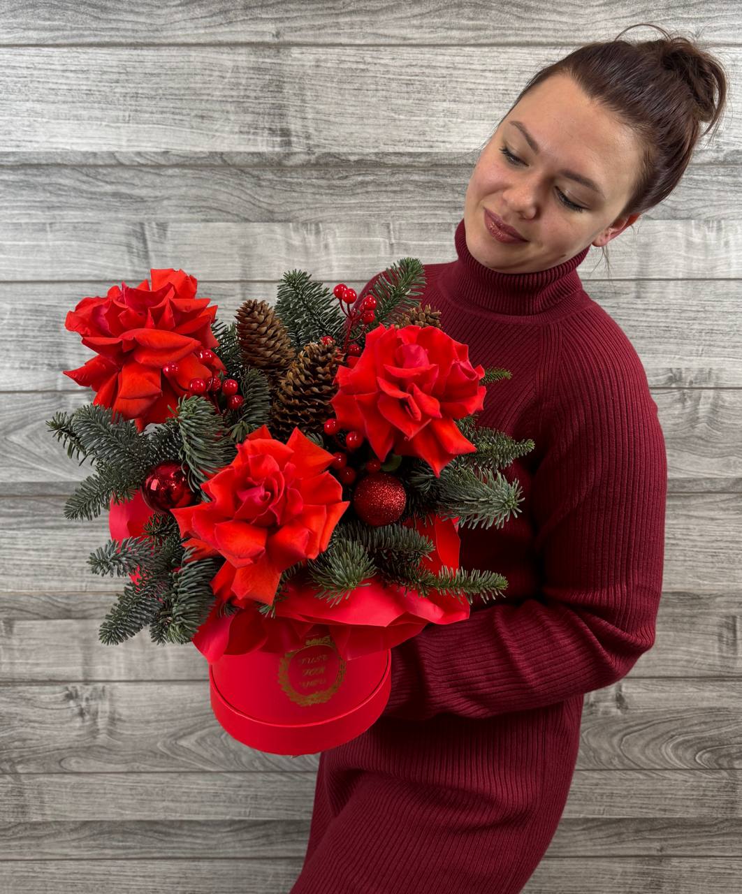 Зимнее волшебство в каждом букете! Красные розы и ель – идеальное сочетание для создания праздничного настроения. Быстрая доставка по городу!