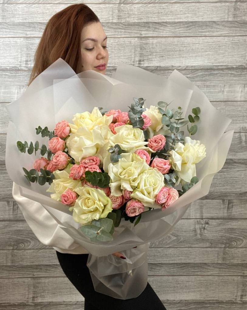 Элегантный сборный букет из французских роз и эвкалипта. Свежие цветы, стильная упаковка и быстрая доставка. Закажите букет на подарок или особый случай.