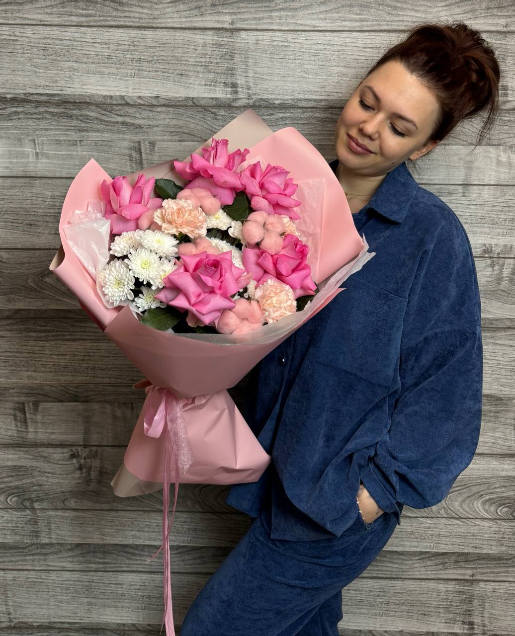 Представляем вашему вниманию изысканный сборный букет, сочетающий в себе нежность французской розы, изящество диантусов, пышность хризантем и уют хлопка.