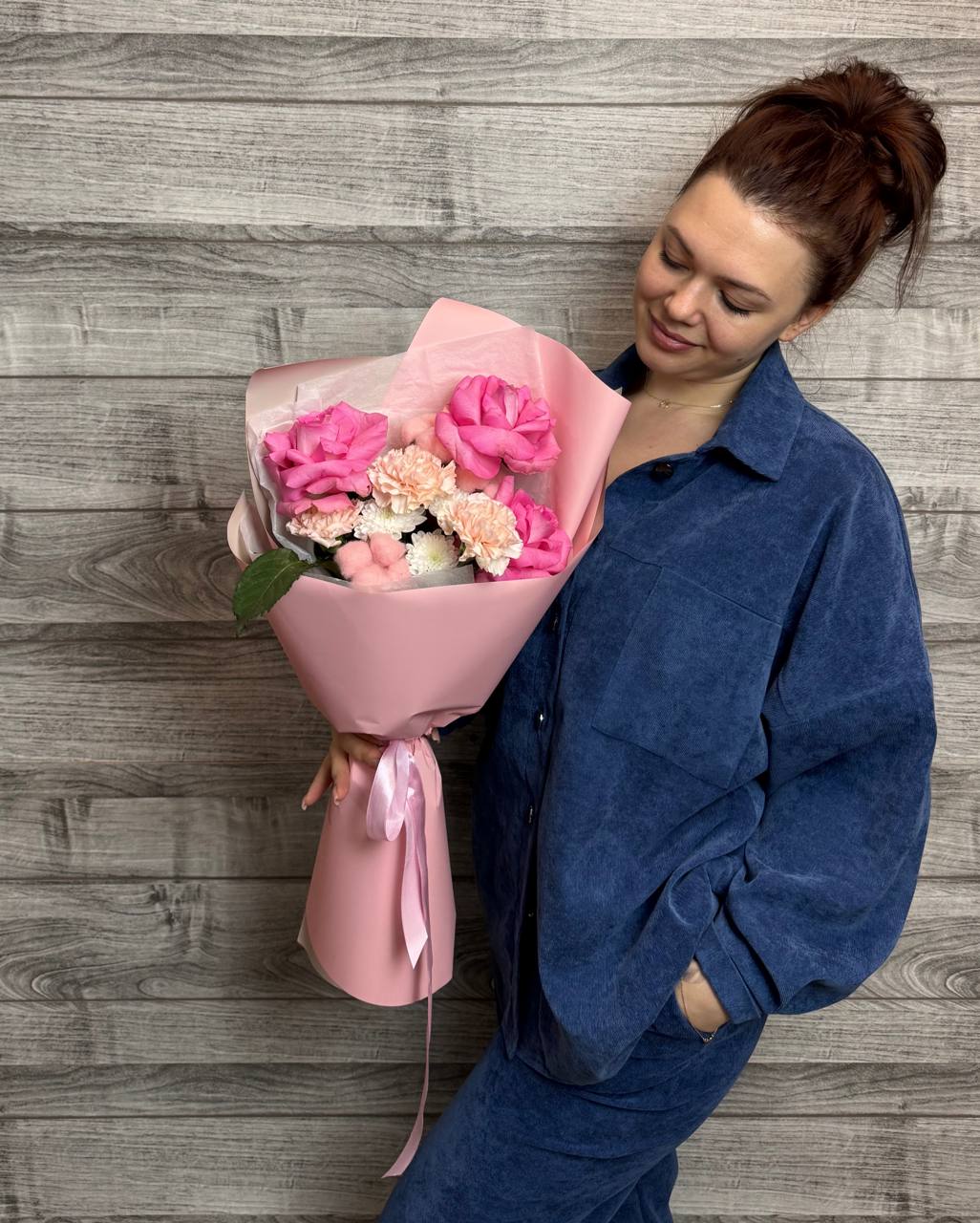 Представляем вашему вниманию изысканный сборный букет, сочетающий в себе нежность французской розы, изящество диантусов, пышность хризантем и уют хлопка.