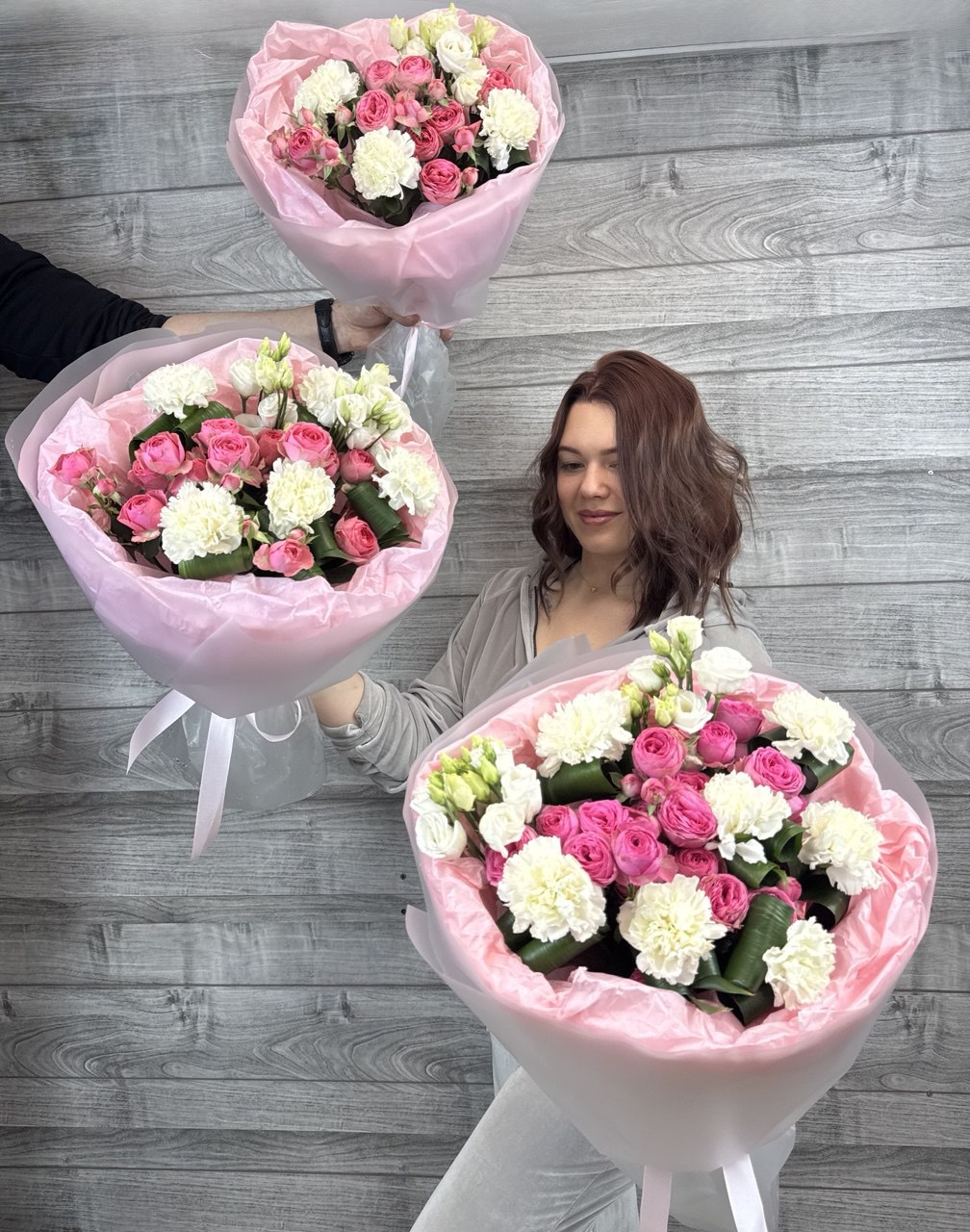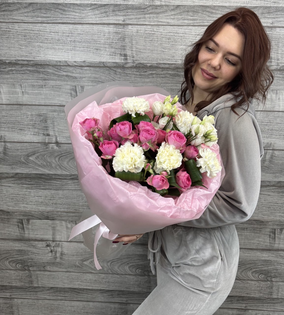 Изысканные букеты кустовых розовых роз и белых диантусов 🌸. Закажите уникальную цветочную коллекцию с доставкой по Балашихе и Москве и подарите нежность!