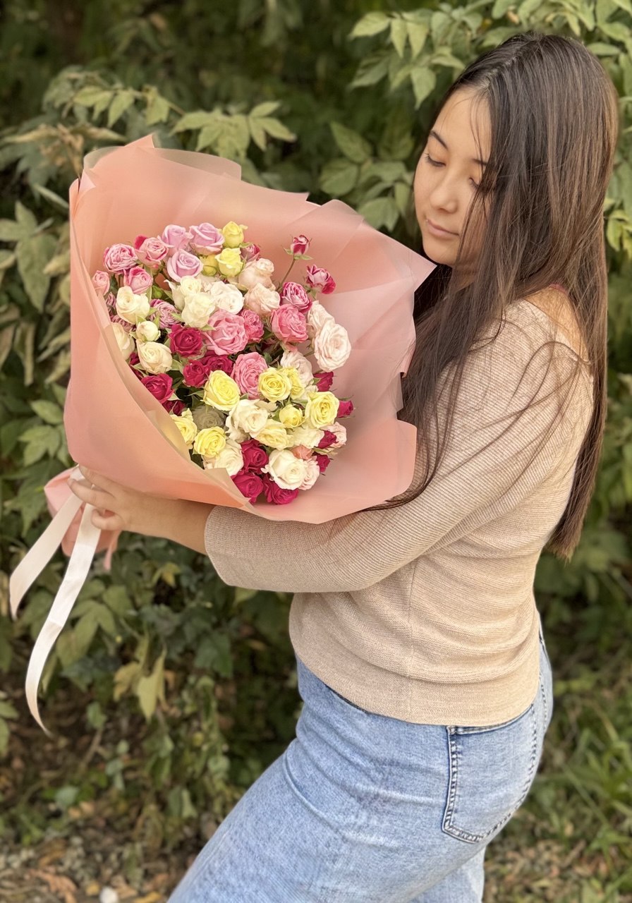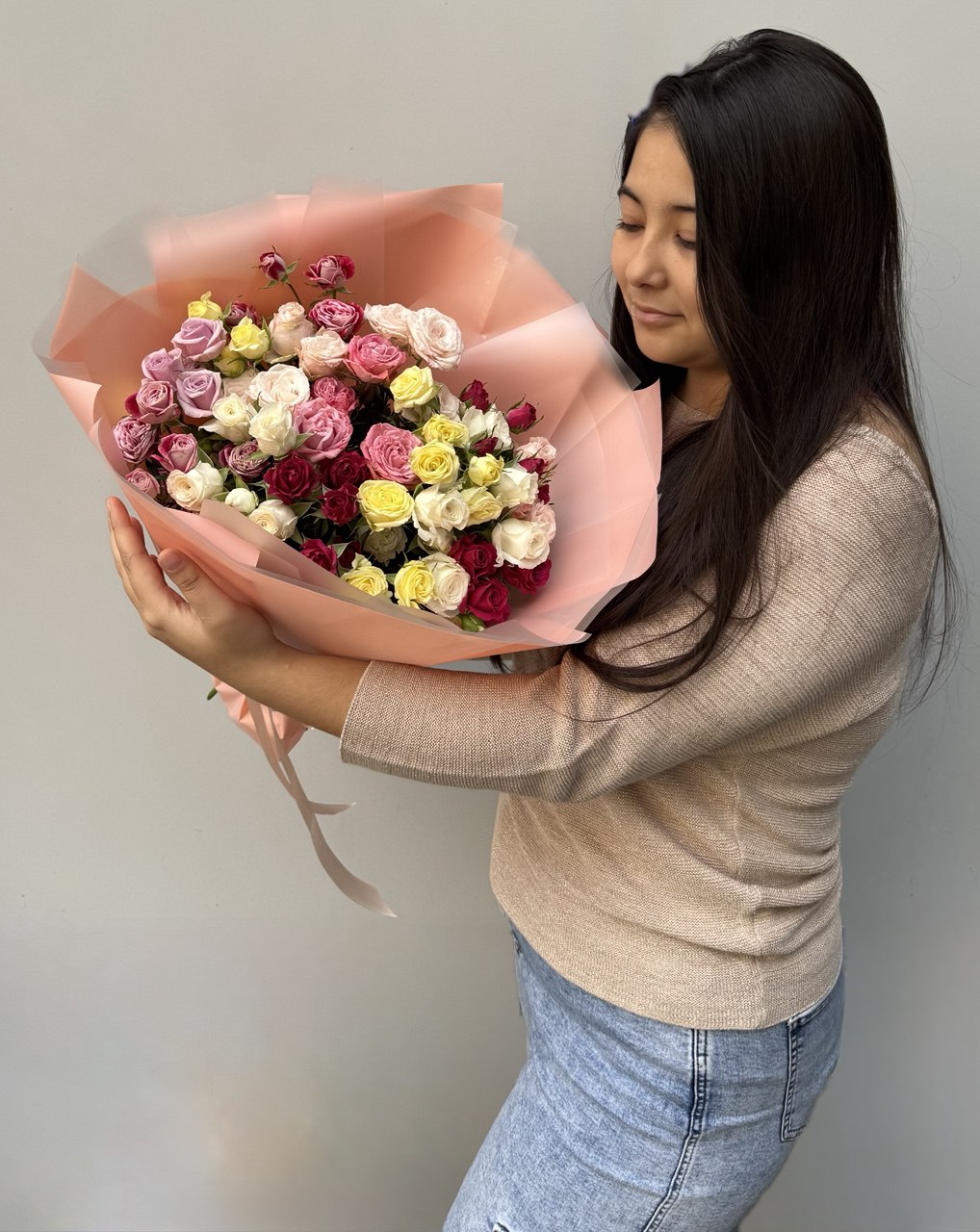Очаровательный букет из кустовых роз микс! Нежные бутоны разных сортов, собранные вместе, создают пышную и воздушную композицию. Разнообразие оттенков – от пастельных до ярких – делает этот букет универсальным подарком для любого случая. Кустовые розы славятся своей пышностью, изяществом и долгим сроком жизни, поэтому этот букет будет долго радовать получателя своей красотой и свежестью. Идеально подходит для выражения любви, благодарности или просто для поднятия настроения!