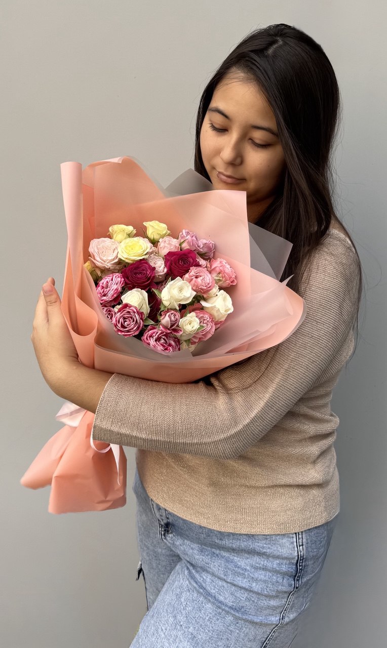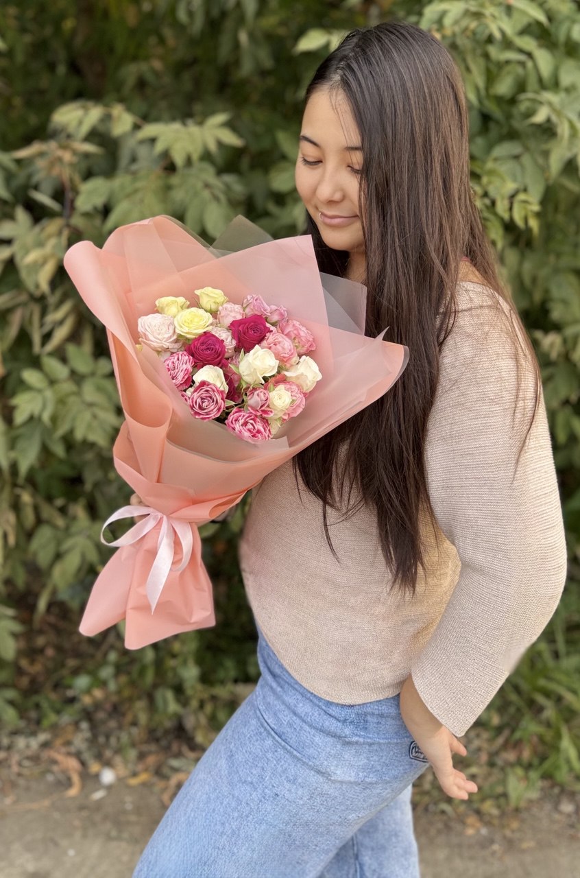 Очаровательный букет из кустовых роз микс! Нежные бутоны разных сортов, собранные вместе, создают пышную и воздушную композицию. Разнообразие оттенков – от пастельных до ярких – делает этот букет универсальным подарком для любого случая. Кустовые розы славятся своей пышностью, изяществом и долгим сроком жизни, поэтому этот букет будет долго радовать получателя своей красотой и свежестью. Идеально подходит для выражения любви, благодарности или просто для поднятия настроения!