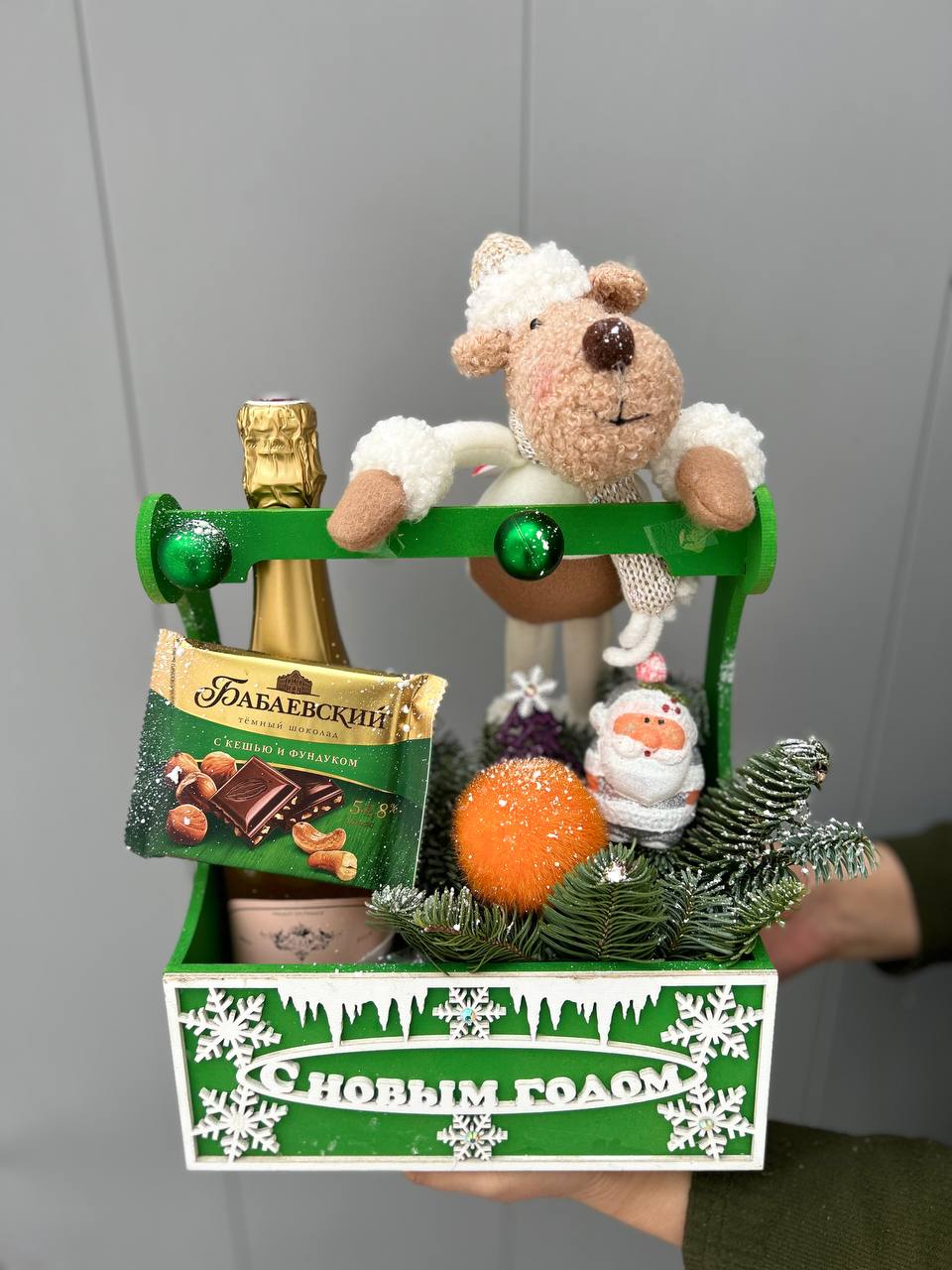 Очаровательная новогодняя зимняя композиция в коробке с декором стеклянными шарами , милой игрушкой, с ароматными веточками датской ели (нобилис) для создания праздничного настроения 🎄✨