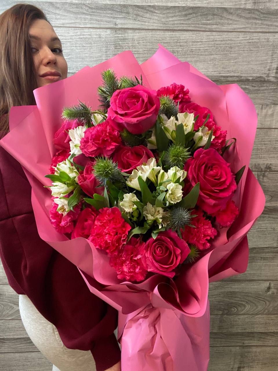 Сборный букет, сочетающий классическую красоту роз, нежность диантусов, изысканность альстромерий и оригинальность эрингиума. Создадим уникальный букет специально для вас! Быстрая и надежная доставка по Балашихе и Москве. Закажите прямо сейчас!