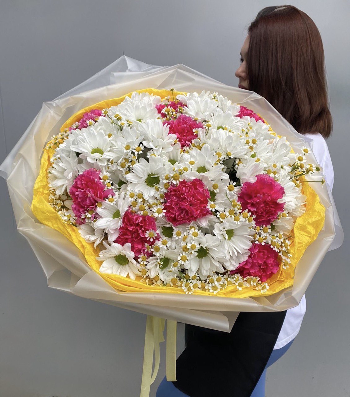 Этот букет – настоящее воплощение свежести и разнообразия! Ромашки придают ему полевой шарм, кустовые ромашковые хризантемы добавляют пышности, а розовые диантусы – нежность и романтику. Идеальный выбор для любого случая.