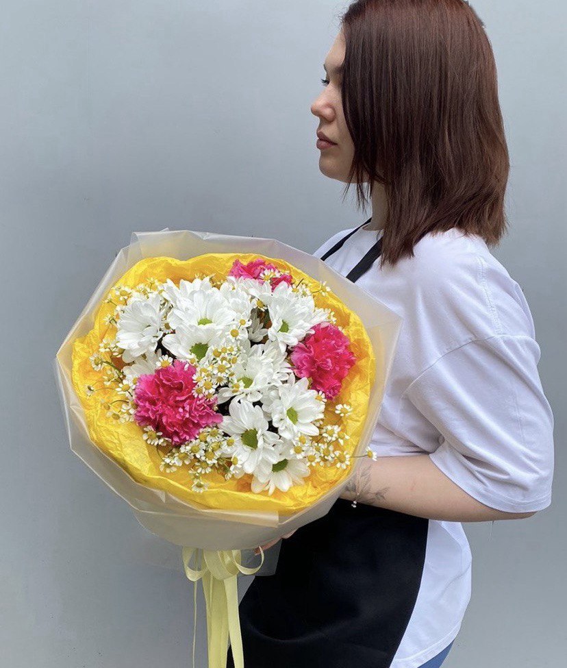 Этот букет – настоящее воплощение свежести и разнообразия! Ромашки придают ему полевой шарм, кустовые ромашковые хризантемы добавляют пышности, а розовые диантусы – нежность и романтику. Идеальный выбор для любого случая.