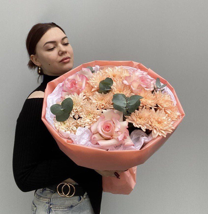 Сборный  букет — коллекция «Карамель» (размер L)  — это идеальное сочетание для уютных вечеров! В нем нежные французские розы, яркие хризантемы и ароматный эвкалипт создают атмосферу тепла и комфорта.