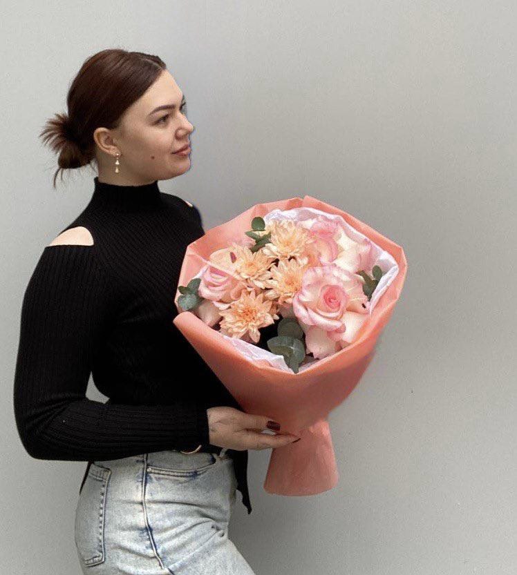 Сборный букет — коллекция «Карамель» (размер S)— это идеальный способ добавить яркие краски в ваш день! В нашем букете вы найдете великолепные французские розы, потрясающие хризантемы и освежающий эвкалипт.